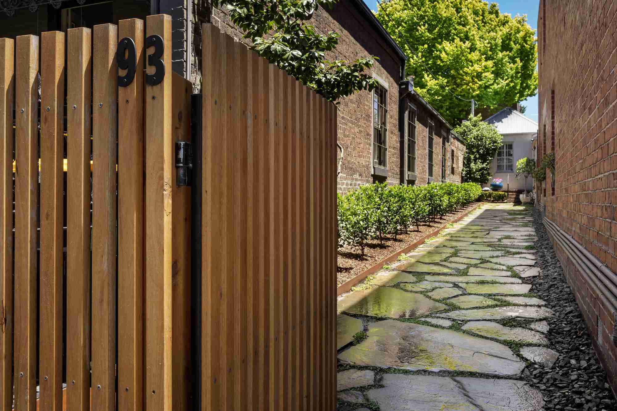 This prestigious property was lacking a prominent entry as it resides at the rear of the block. By laying striking Kanmantoo stones and framing it with a Ficus hedge, this space now extends an warm welcome. The handcrafted timber fence created clarity for guests and a sense of privacy for residents.